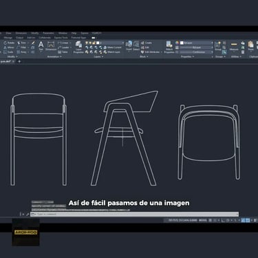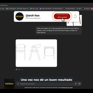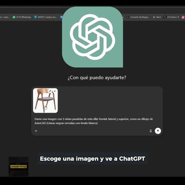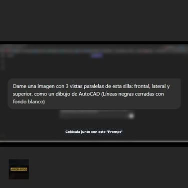 Coloca el Prompt: Coloca el siguiente prompt para que nos genere la imgen en formato AutoCAD con vistas en planta, alzado y lateral: "Dame una imagen con 3 vistas paralelas de esta silla: frontal, lateral y superior, como un dibujo de AutoCAD (Líneas negras cerradas con fondo blanco)".