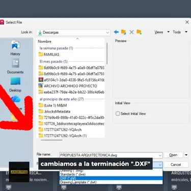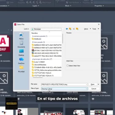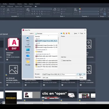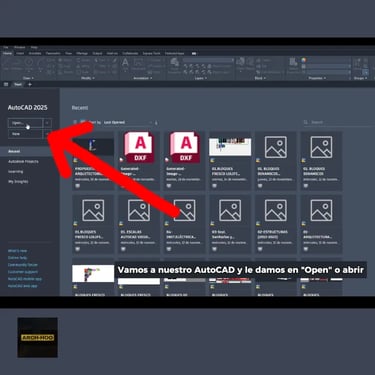 Abrimos el Archivo: Con nuestro archivo .DXF, lo primero que tenemos que hacer es abrir AutoCAD, en el inicio, damos clic en "Open o Abrir" y en el buscador, cambiamos el tipo de archivos a DXF (.DXF). Seleccionamos nuestro archivo descargado y listo, AutoCAD deberá abrirlo.